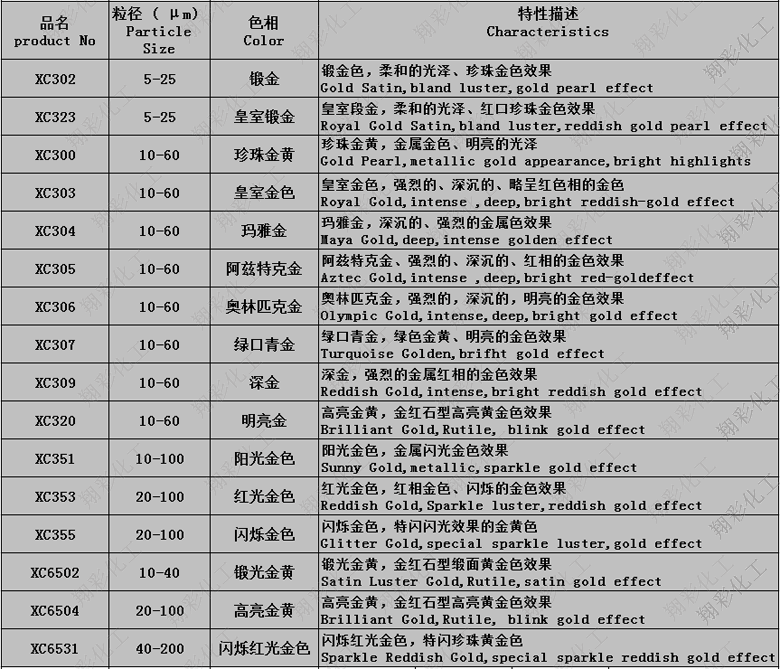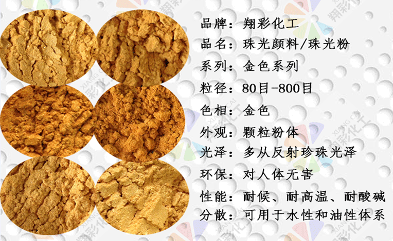 翔彩化工默克高亮金色珠光粉系列,具有色泽稳定、颗粒均匀、耐酸碱、耐日照等特点,应用于涂料、