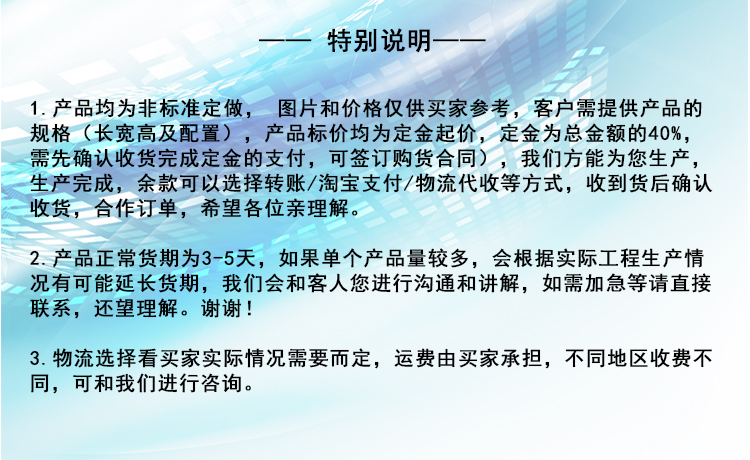 温馨提示:本产品均为非标准定做,客户需提供产品的规格(长宽高及配置),标价均为定金起价,定金为总金额的40%,需拍下立刻付款确定收货方为完成预定生效,余款可通过货到付款或验收完毕后提货前转账,本店为厂家直销,价格优惠,提供发票,品质保证,虔诚为您服务。如需了解详情请在线咨询或致电:13713137885朱生 QQ:413911814