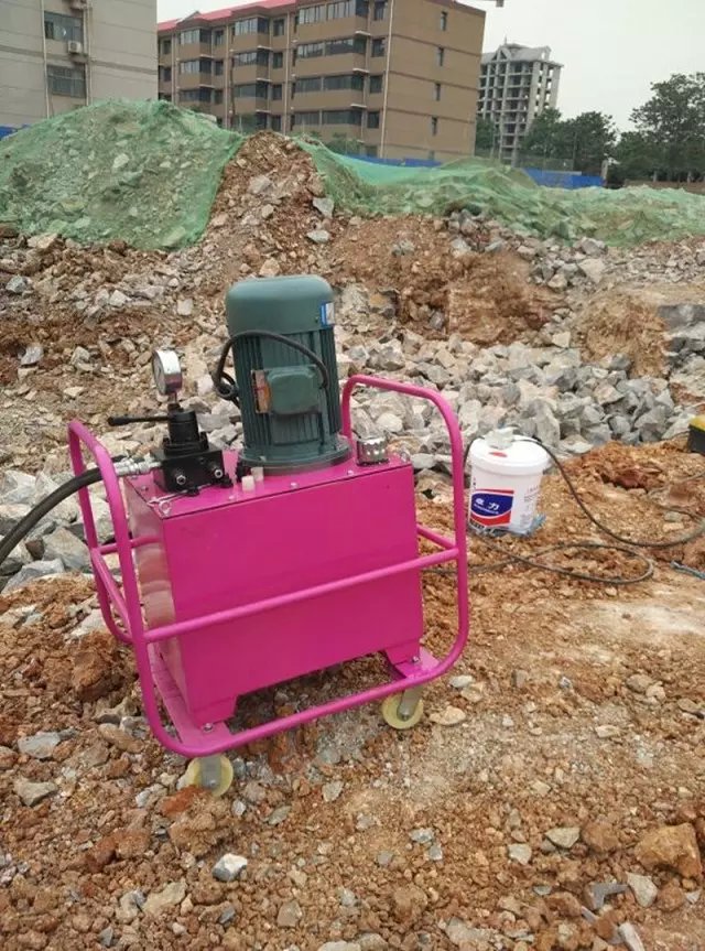 液压劈裂机是我们公司的专利产品,它是以动力站(有电动型动力站和柴油机型动力站)产生的高压液压油为能量源,通过油管输送到各个劈裂器(又名劈裂枪)的油缸管,控制劈裂器内的活塞杆的推动伸缩,并巧妙的应用了楔器原理,使劈石作用力达到几百吨甚至上千吨,而岩石和混凝土虽然外部抗压强度很大,但是其内部的抗拉强度却相对有限,正是由于彼此的这些特性,所以用劈裂器可以在几秒钟内轻易地把巨石劈裂开,使坚硬的矿石从山体中分离。