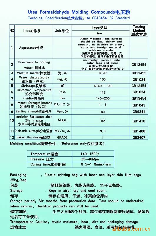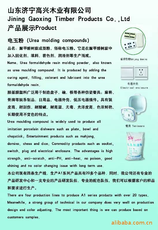 该产品是以尿素甲醛树脂为基材,木浆为填料,添加润滑剂、固化剂、颜料及其它添加剂而制成的。本产品外观为颗粒状,适用模压和注塑成型。