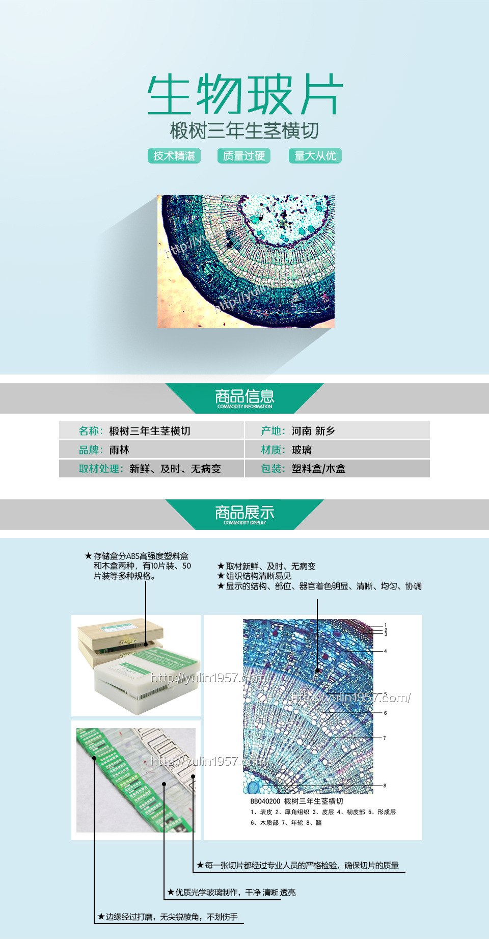 严格按照生物玻片的标准生产,是高质量、高清晰的切片标本。