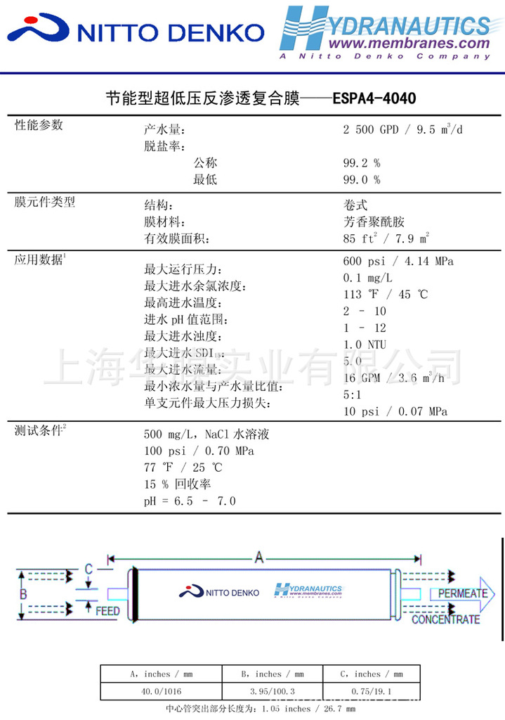 ESPA4-4040 系列4英寸膜元件的性能参数