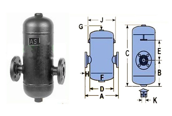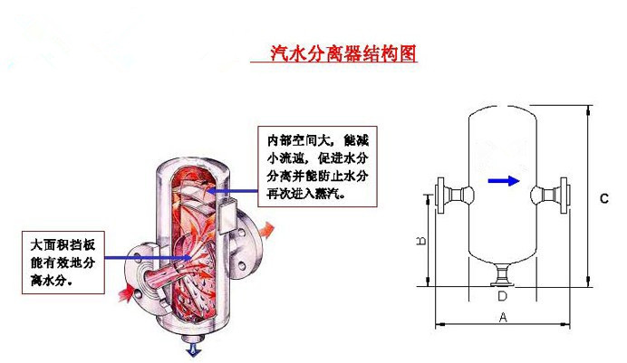 工作原理:大量含水的蒸汽进入汽水分离器,并在其中以离心向下倾斜式运动。夹带的水份由于速度的降低而被分离出来。被分离出来的液体流入下部经疏水阀排出体外,干燥清洁的蒸汽从分离器出口排出。