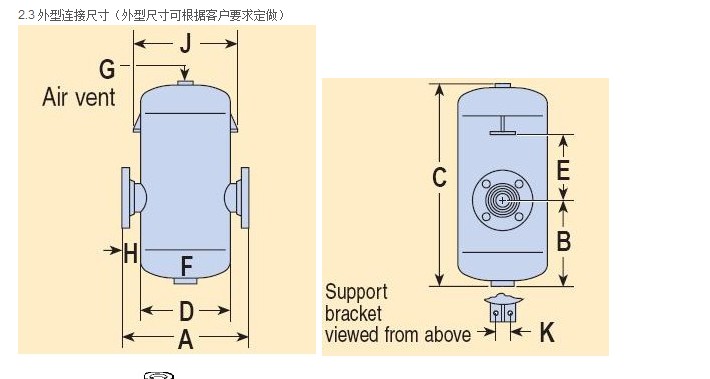 设计连接尺寸: 规格 设计压力(MPa) 外形尺寸(mm) 重量(kg) 容量(L) A B C D E F G H J K DN15 1.6 350 200 450 108 120 1/2″ 1/2″ 121 148 30 11 2 DN20 1.6 350 200 450 108 120 1/2″ 1/2″ 121 148 30 12 2 DN25 1.6 350 200 500 159 120 1/2″ 1/2″ 95 213 30 20 6 DN32 1.6 350 220 500 159 120 1/2″ 1/2″ 95 213 30 22 6 DN40 1.6 360 220 500 159 120 1/2″ 3/4″ 100 213 30 23 6 DN50 1 420 220 638 219 159 1″ 3/4″ 100 263 30 40 18 DN65 1.6 420 252 6380 219 159 1″ 3/4″ 100 263 30 47 18 2.5 420 252 638 219 159 1″ 3/4″ 100 263 30 49 18 DN80 1.6 523 332 735 273 145 2″ 3/4″ 125 368 30 80 33 2.5 523 332 735 273 145 2″ 3/4″ 125 368 30 88 33 DN100 1.6 574 337 795 324 163 2″ 3/4″ 125 384 40 98 51 2.5 574 337 795 324 163 2″ 3/4″ 150 384 40 106 51 DN125 1.6 656 310 843 356 230 2″ 3/4″ 150 416 44 115 67 3 656 310 843 356 230 2″ 3/4″ 150 416 44 134 67 DN150 1.6 706 347 935 406 246 2″ 3/4″ 150 466 60 154 96 3 706 347 935 406 246 2″ 3/4″ 150 465 60 172 96 DN200 0.6 850 460 1200 500 372 2″ 2″ 175 560 60 275 185 1.6 850 460 1200 500 372 2″ 2″ 175 560 60 280 185 3 850 459 1200 500 372 2″ 2″ 175 568 60 280 230 DN250 0.6 950 615 1580 600 530 2″ 2″ 175 688 72 475 333 1.6 950 615 1580 600 530 2″ 2″ 175 688 72 475 333 3 960 615 1580 600 530 2″ 2″ 175 698 72 475 333 DN300 0.6 1000 740 1700 600 540 2″ 2″ 200 688 72 500 330 1.6 1000 740 1700 610 540 2″ 2″ 200 688 72 500 330 3 1010 740 1700 610 540 2″ 2″ 200 698 72 500 330 DN350 0.6/1.6/3.0 1100 754 1800 700 525 2″ 2″ 200 816 72 550 537 DN150 1.6 970 490 1260 620 372 2″ 2″ 175 764 72 303 290 DN250 1.6 1175 615 1500 824 440 2″ 2″ 175 988 108 630 53