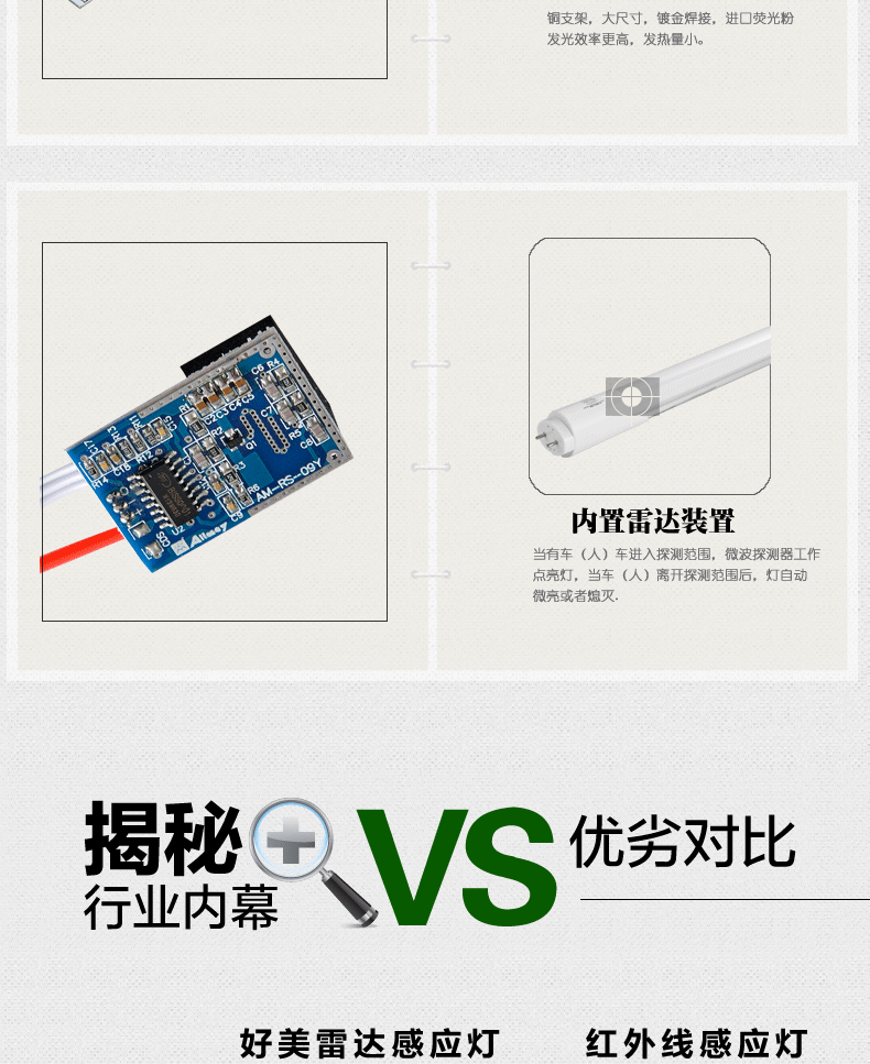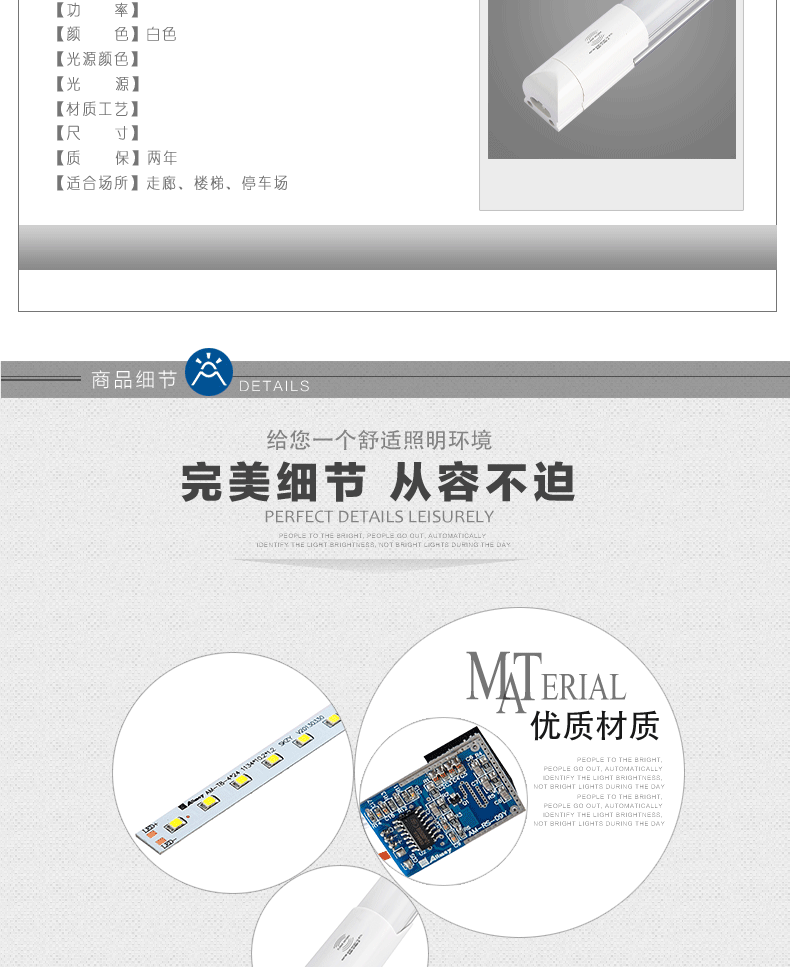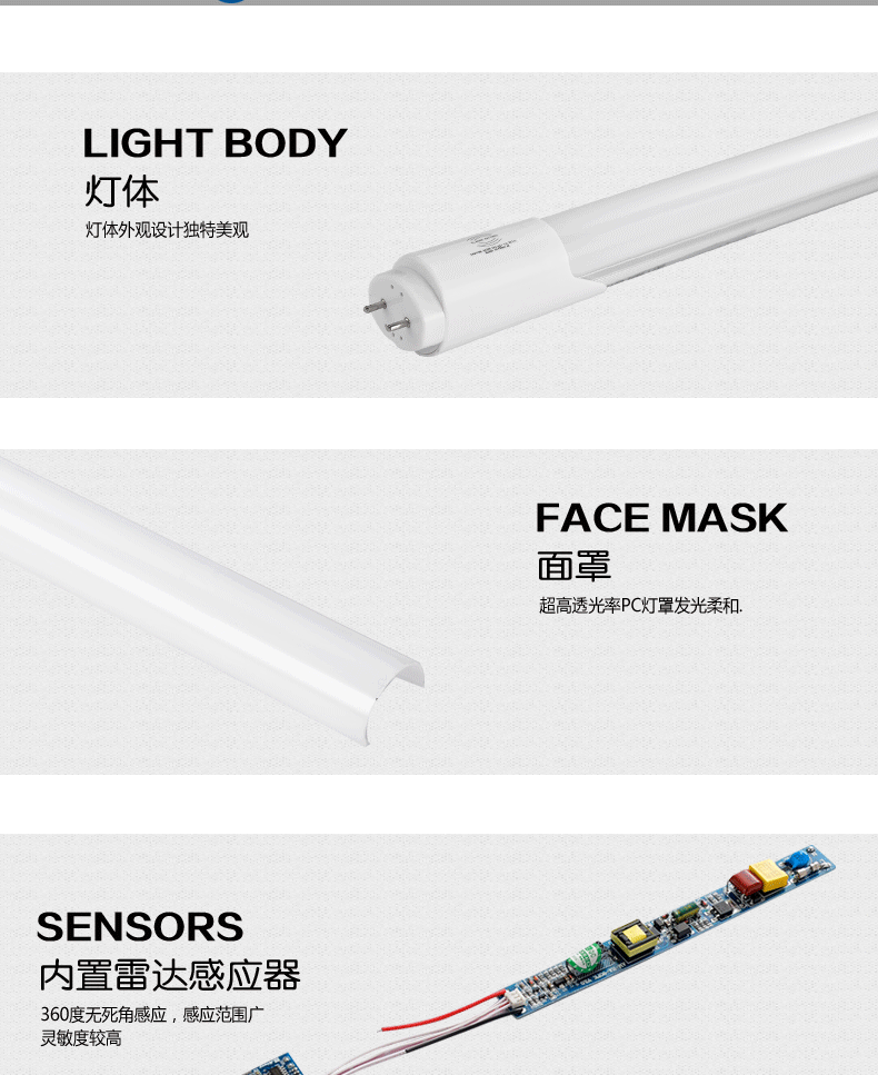 静止时超低照明功耗,一般为2-2.5W;3. 人体进入时,自动感应满负荷工作,18W(1.2米灯具)4. 满载工作时间:18秒-25秒根据环境可调;5.