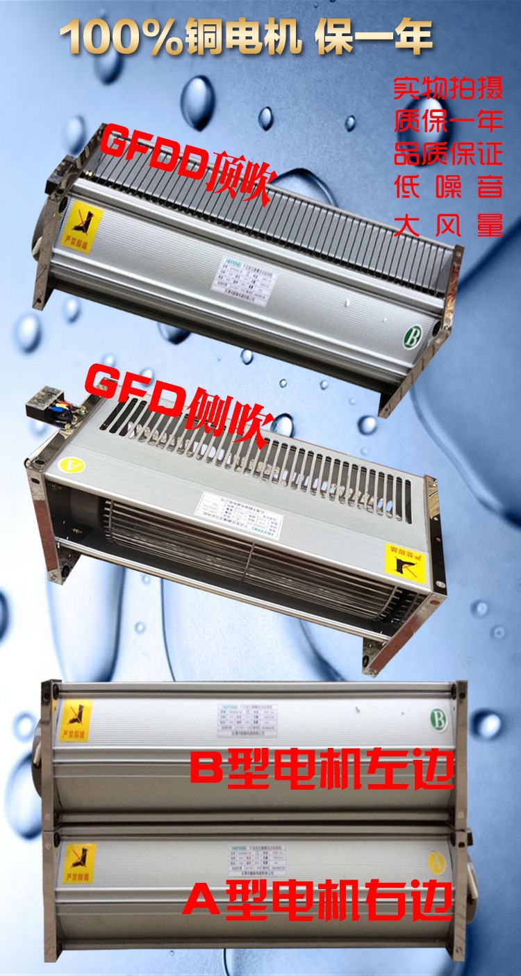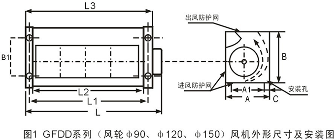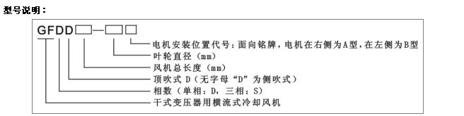 例:风机型号为GFDD470-120A,表示工作电压单相220V、风机总长为470mm,叶轮直径为120mm,电机安装在右侧的顶吹式干式变压器用横流式冷却风机。