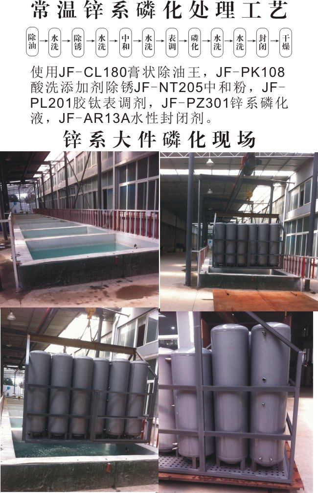 应用说明 本品系常温条件下配合使用的钢铁表面锌系磷化液(JF-PZ301俗名皮膜剂A、JF-PZ301俗名皮膜剂B),广泛用于钢铁工件电泳、喷塑、喷漆、浸塑等表面涂装前的磷化处理,浸渍、喷淋均可,经夲品处理后的磷化膜呈灰色、结晶细而致密、耐蚀性能强、明显提高基体与涂层的结合力,且增加工件表面的平滑和光亮度,适用于各种钢铁制品工件,适用于金属加工及制造业,如机加制品、钢铁构件、钢门钢窗、仪器仪表箱柜壳体、高低压电器设备、汽车、拖拉机、电冰箱、洗衣机、家用电器等行业的产品在进行油漆或粉末静电喷涂前(即涂装前)的磷化处理。亦可用于锌合金处理。配合防锈剂(如JF-AR28、AR18、AR38、AR58等)或封闭剂(如JF-AR68、AR88等)也作为终处理。