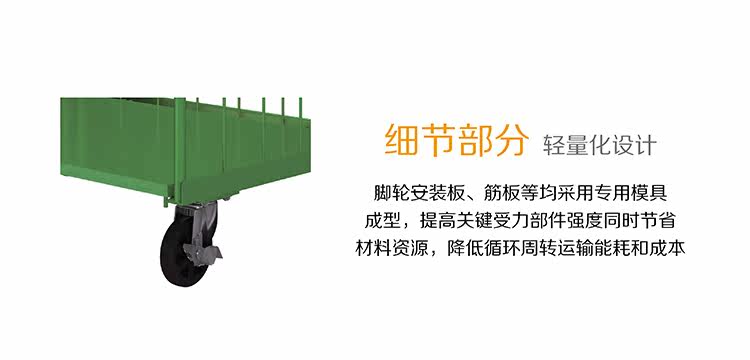 - 工艺特点:轻量化设计:脚轮安装板、筋板均采用专用模具成型,提高关键受力部件强度同时节省材料资源,降低循环周转运输能耗和成本;挂杆连接设计:前挂杆连接件专业模块化设计,美观、耐用;静电防锈工艺:表面采用静电防锈工艺处理,静电喷塑形成;特殊防锈保护层,美观更耐用;高品质静音橡胶轮配置;标准脚轮配置:6寸两万向,两万向带刹车橡胶轮。