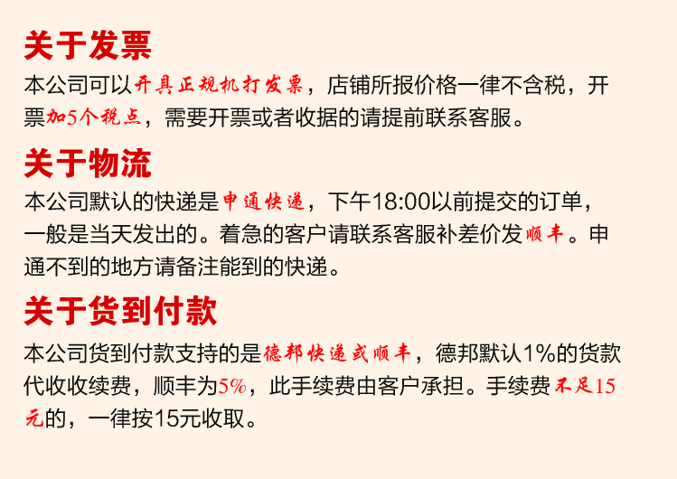 本公司货到付款德邦默认的是1%的货款代收收续费,顺丰是5%的代收手续费,