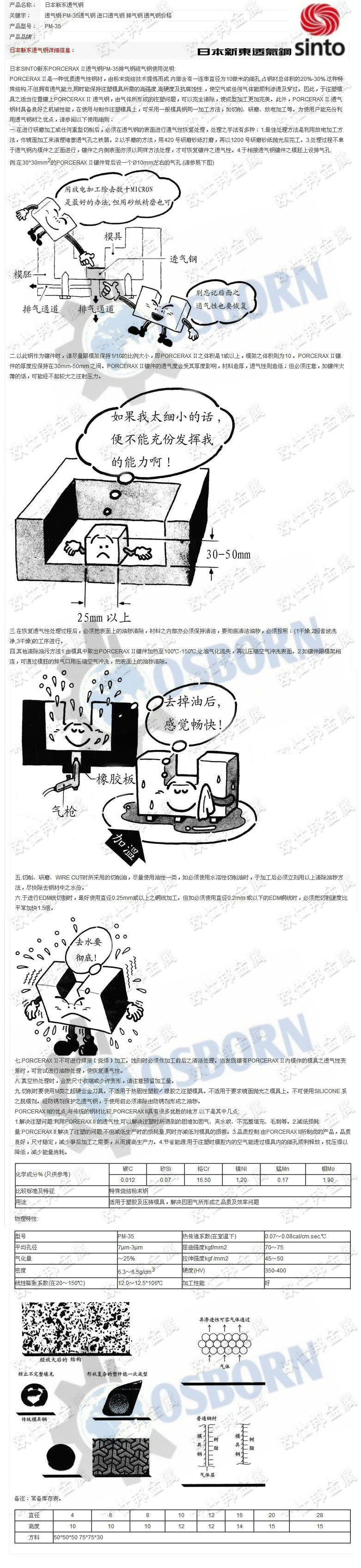 七.PM-35透气钢不可进行焊接(烧焊)加工。蚀刻时必须作加工前后之清洁处理。当发现镶有PM-35透气钢内模件的模具之透气性变差时,可尝试进行油秽处理,使其恢复通气性。