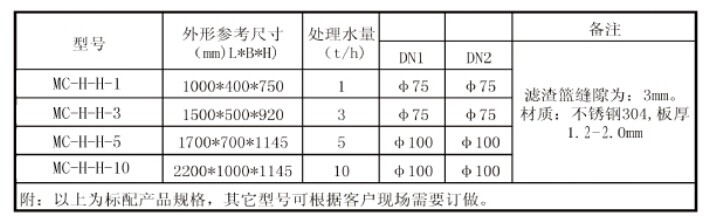 立烨MC-H-H型无动力隔油器选用全304食品级不锈钢板材(SUS304),经10年以上工龄技工精工制作,不锈钢箱体结构表面平整、洁净、焊缝一气呵成、外观完美,没有粗糙面、气泡、咬边、裂纹、分层等缺陷。 立烨MC-H-H型无动力隔油器各项技术参数指标均按照国家标准《建筑给水排水设计规范》(CJ/T295--2008)中的标准设计、制造,外排废水中动植物油的含量低于《污水综合排放标准》中的三级标准(30mg/L)。
