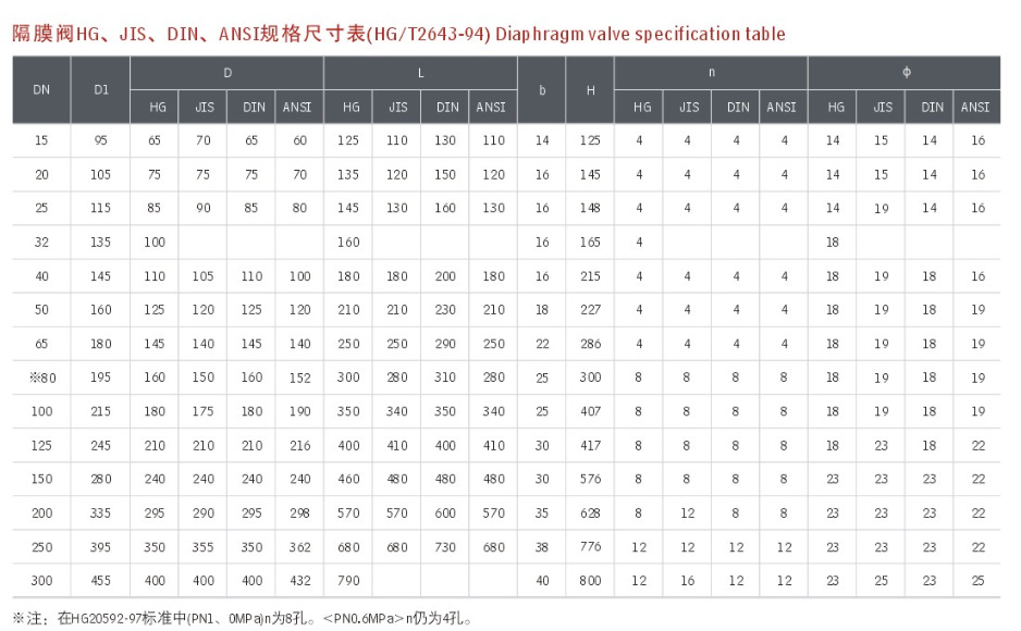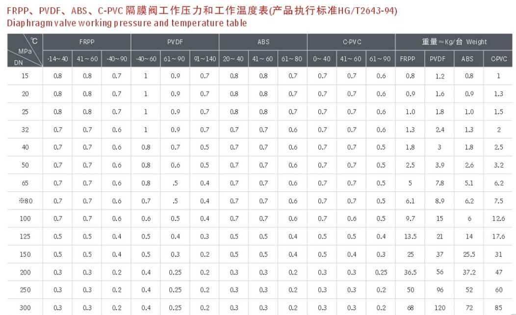 隔膜阀的结构简单、流体阻力小、流通能力较同规格的其他类型阀大;无泄漏,能用于高粘度及有悬浮颗粒介质的调节。隔膜把介质与阀杆上腔隔离,所以没有填料介质也不会外漏。但是,由于隔膜和衬里材料的限制,耐压性、耐温性较差,一般只适用于1.6MPa公称压力和150℃以下。