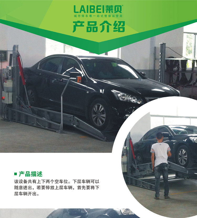 莱贝停车设备主要产品有两柱双层立体停车设备,四柱双层立体停车设备,俯仰双层立体停车设备,升降横移式停车设备、地坑式立体停车设备等。