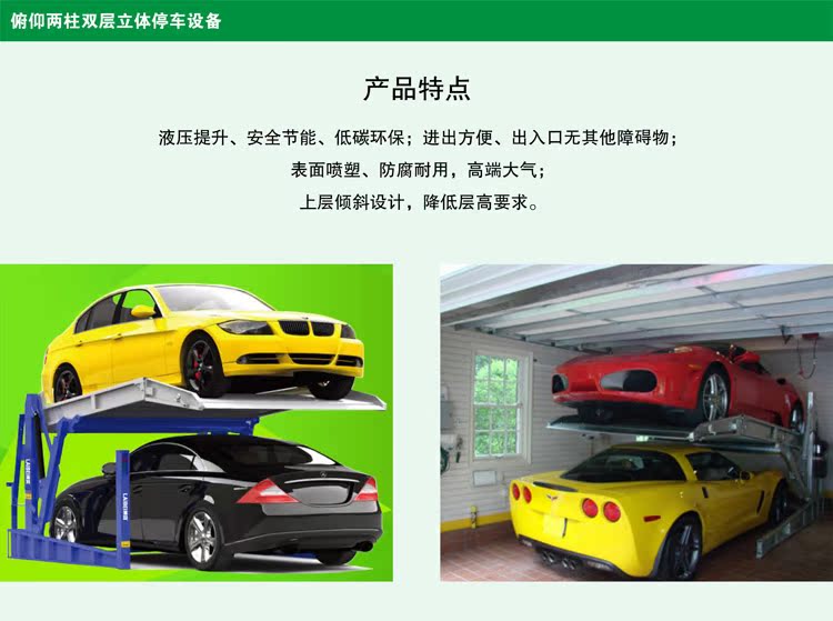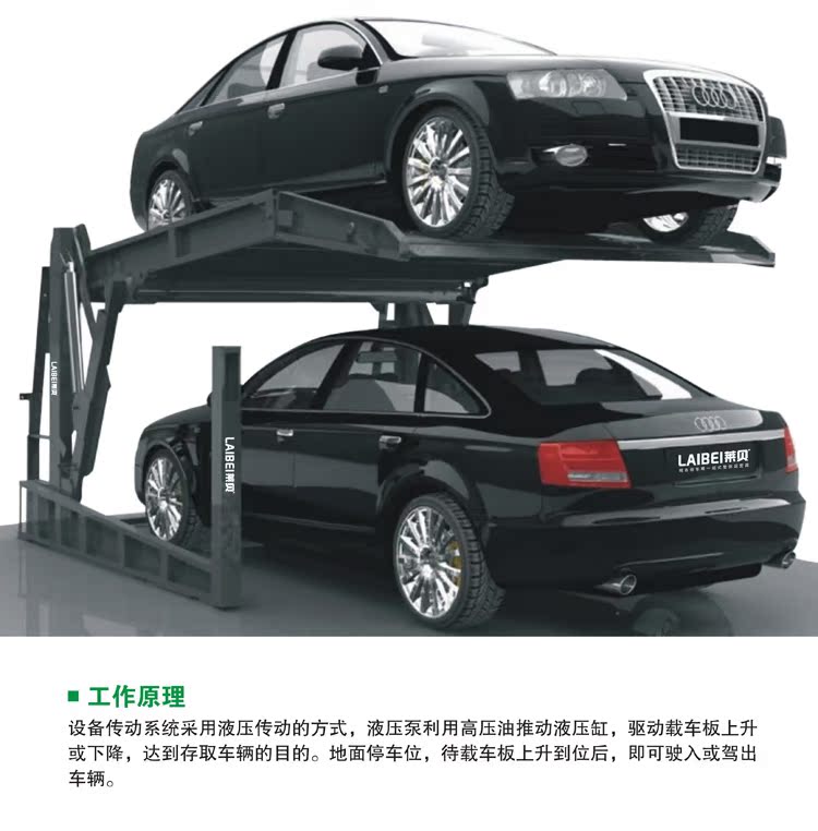 立体车库-自动泊车-车库专家四川成都俯仰两层立体停车设备LAIBEI莱贝家用立体车库机械简易停车厂家举升重量2000kg举升高度1750mm立柱高度1842mm进车宽度2100mm电机功率2.2kw电压220V或330V均可液压驱动控制表面喷塑或镀锌电动控制