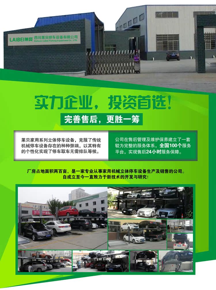 “信誉,客户至上”是公司的宗旨,“诚信立足,创新致远,品质取胜,携手共赢”是公司的经营理念。四川莱贝停车设备有限公司愿同各界同仁亲密合作,共创中国家用立体停车设备之未来!