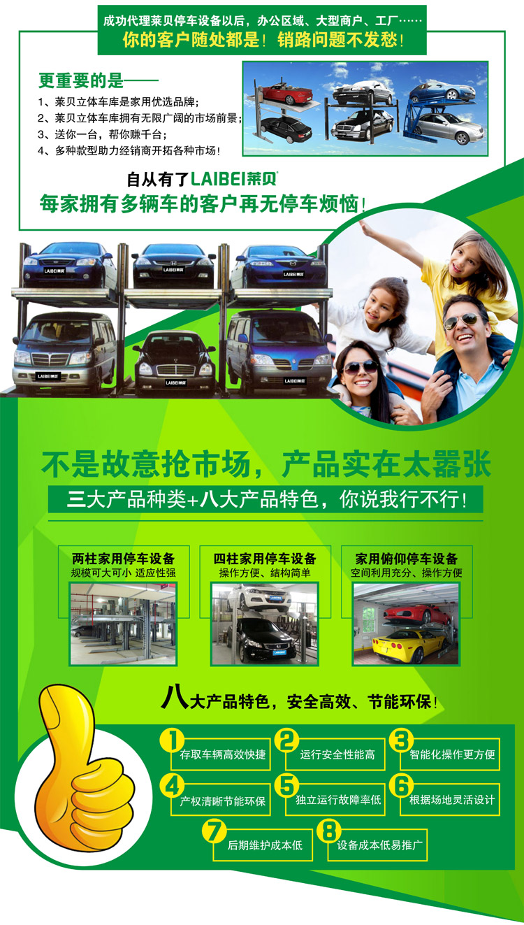 三、莱贝成功研发“莱贝家用智能立体停车设备”填补了家用停车设备行业的空白,获得国家专利。彻底解决了传统PSH升降横移类停车设备PCS垂直升降类停车设备难以被大众市场接受的难题,满足了***多停车位的特点,让客户有限的资金施展的停车空间。安全、高效、快捷、省地、省电、省心是“莱贝家用立体停车设备”靓丽标签。