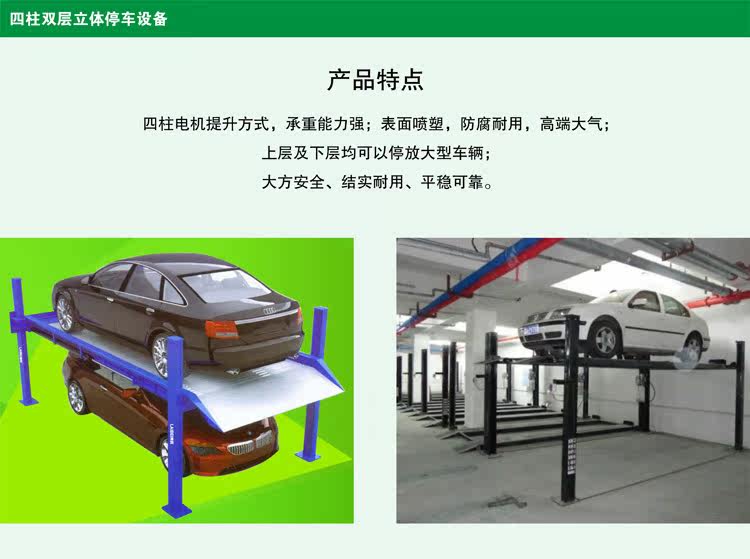 莱贝停车设备主要产品有两柱双层立体停车设备,四柱双层立体停车设备,俯仰双层立体停车设备,升降横移式停车设备、地坑式立体停车设备等。
