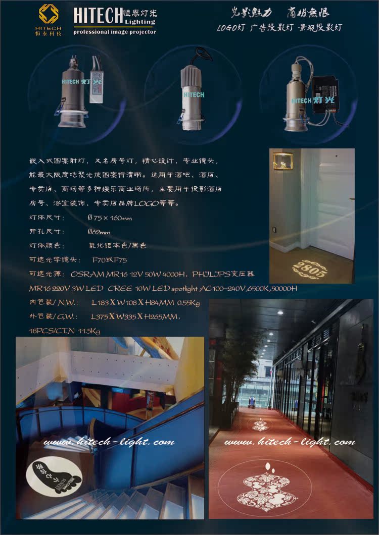 深圳中星恒泰科技有限公司致力于LED照明研发生产及商业化应用,公司生产的商业照明、家居照明、户外照明、工业照明系列产品在各个方面都得到广泛应用。在商业形像广告应用方面更是最专业的图案成像灯-logo灯,投光灯,广告投影灯的系统生产商,我们提供的优质产品广泛应用在特色娱乐活动场所,展览馆,品牌专卖店,宾馆,酒店,酒吧,咖啡屋,茶馆,商场等营造优美舒适的商业消费环境,在机场,车站,公园,广场,建筑外墙等人流量密集的公共场所指示方向,展示企业形象,商品/服务推广......LOGO灯(广告投影灯)用光线来传递商业信息/展示公司形象被使用得越来越广泛.我们的目标是用光创造智慧美好生活。
