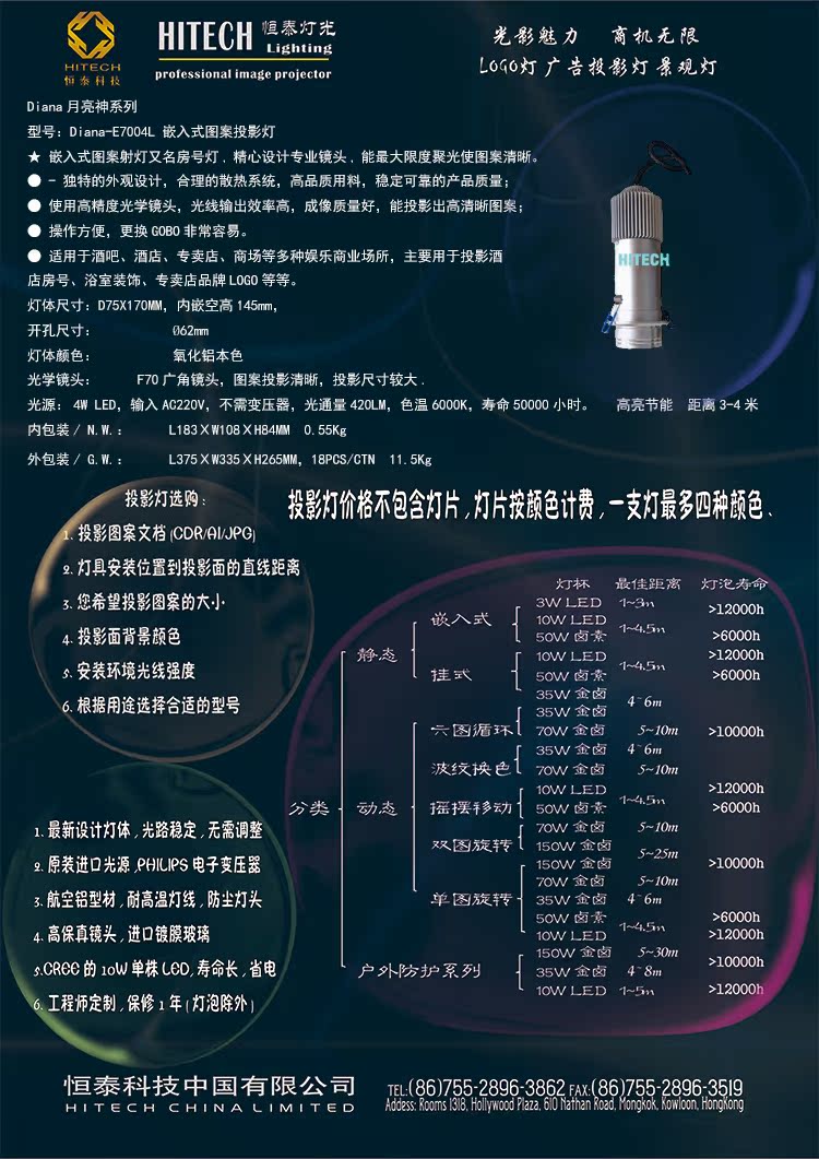 我们专注于投影灯( logo灯 )商业化应用,依靠公司在LED照明行业的雄厚实力,拥有多项技术专利,研发生产销售LED投影灯,LED舞台灯光,LED 投光灯,LED景观灯,LED标识灯,LED投影广告灯,LED大型户外投影广告灯,是专业的LED投影灯生产厂家. 动态投影灯如旋转投影灯,摇头投影灯,双图旋转投影灯,动态背景投影灯,多图轮换投影灯等能产生动画,飘移,旋转,水波纹,感应互动等新奇效果,有效吸引众人目光关注。1.进口CREE专业LED芯片,自主研发电源,驱动,光源,成像光学镜头。2.优化设计航空铝材灯体,小巧美观,散热效率高。3.全封闭结构防尘,防雨,防漏电。4.灯片封装专利技术,使灯片安装更换简单快捷。