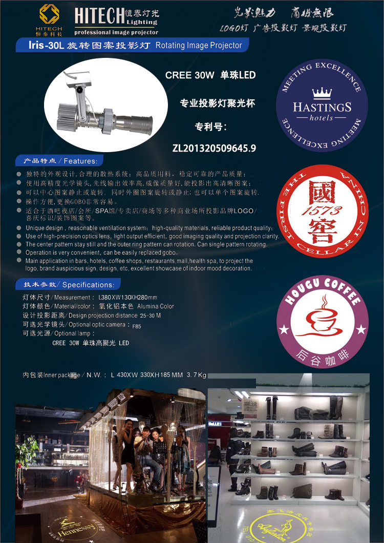 我们专注于投影灯( logo灯 )商业化应用,依靠公司在LED照明行业的雄厚实力,拥有多项技术专利,研发生产销售LED投影灯,LED舞台灯光,LED 投光灯,LED景观灯,LED标识灯,LED投影广告灯,LED大型户外投影广告灯,是专业的LED投影灯生产厂家. 动态投影灯如旋转投影灯,摇头投影灯,双图旋转投影灯,动态背景投影灯,多图轮换投影灯等能产生动画,飘移,旋转,水波纹,感应互动等新奇效果,有效吸引众人目光关注。1.进口CREE专业LED芯片,自主研发电源,驱动,光源,成像光学镜头。2.优化设计航空铝材灯体,小巧美观,散热效率高。3.全封闭结构防尘,防雨,防漏电。4.灯片封装专利技术,使灯片安装更换简单快捷。