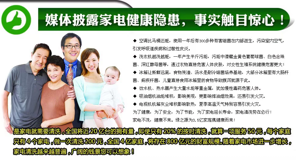 目前,随着国内经济的快迅发展,家用电器已经普及。特别是沿海地区一些发展较快的城市,家电成为每家每户必不可少的普及率几乎达到了100%。然而,像洗衣机、空调,油烟机,冰箱等等这些家电给人们的生活带来的非常大的方便同时,大家却忽视了隐藏在背后的巨大“安全隐患”。家电在使用过程中产生的污染,也成为了潜伏在人们身边的安全和健康“杀手”。因此暗藏在家家户户财富商机慢慢的涌现出来。