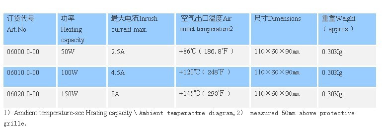 | 技术参数 | 【技术数据】工作电压:120 - 240V AC/DC(最小110V,最大265V) 加热元件:PTC,自动调节并限制温度 散热体:挤压铝型材,阳极化 连接:3只夹式端子台,接入线经0.5 -2.5mm连接 外壳:适用于UL94 V-0黑色塑料 安装:35mm DIN导轨卡装(EN 50022) 装配位置:垂直 储存温度: -45至+70 °C(-49到158℉) 保护等级:IP20 /口(接地) 认证:CE *工作电压低于140V AC/DC时,加热性能降低约10%. 【订货编号】 订货编号功率浪涌电流最大值尺寸重量(大约) 06000.0-00 50W 2.5A 110x60x90mm 0.30kg 06010.0-00 100W 4.5A 110x60x90mm 0.30kg 06020.0-00 150W 8A 110x60x90mm 0.30kg *在20℃(68℉) |