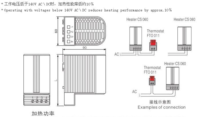 主要用于有关电气和电子的配件的开关中,其设计采用自然对流方案,从产品加热体到外壳表面的设计采用温度逐渐降低的设计理念。我们全系列的温控器和湿度控制器均可直接连接到加热器CS060上使用。其次该加热器也可与外挂恒温器连接,不有单独线。