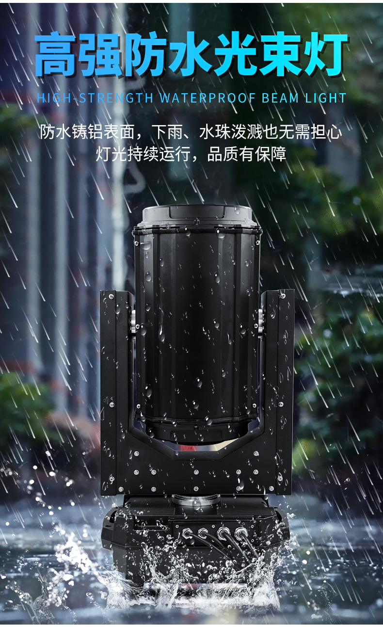 XM380 IP是一款高光效、低噪音、多功能的全天候灯具,防水等级达到IP65,直径175mm出光镜头,粗实的光束类似一个强大的探照灯,光束投射距离可以达到200m甚至更远,足以挑战任何大功率探照灯效果。采用OSRAM SIRIUS HRI 371W S低能耗的金卤杯泡光源,充分发挥此光源的高寿命、高光效的优越性能。可灵活塑造光斑均匀、缤纷斑斓的图案效果,轻松展现精彩纷呈的幻影灯效。混色均匀,色彩还原性极佳,能打造流光溢彩的舞台光影视觉,全方位提升舞台演出水平。