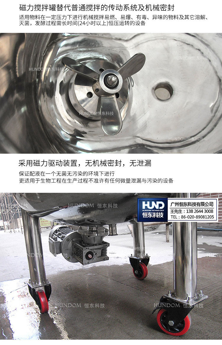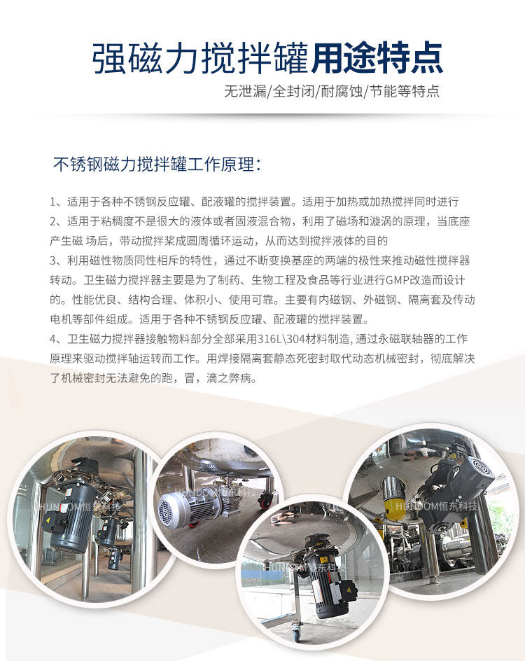 磁力配料罐是不锈钢罐中要求较高的罐体,磁力配料罐的搅拌装置是磁力搅拌器,安装于配料罐的底部,通过永磁联轴器的工作原理来驱动搅拌轴运转而工作。
