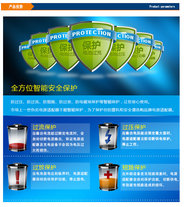安全节能标准:过充保护,智能供电,过流,过压,恒温,短路(OCP OVP OTP SCP)保护