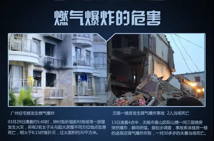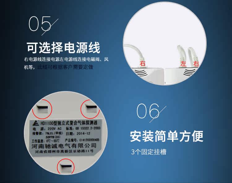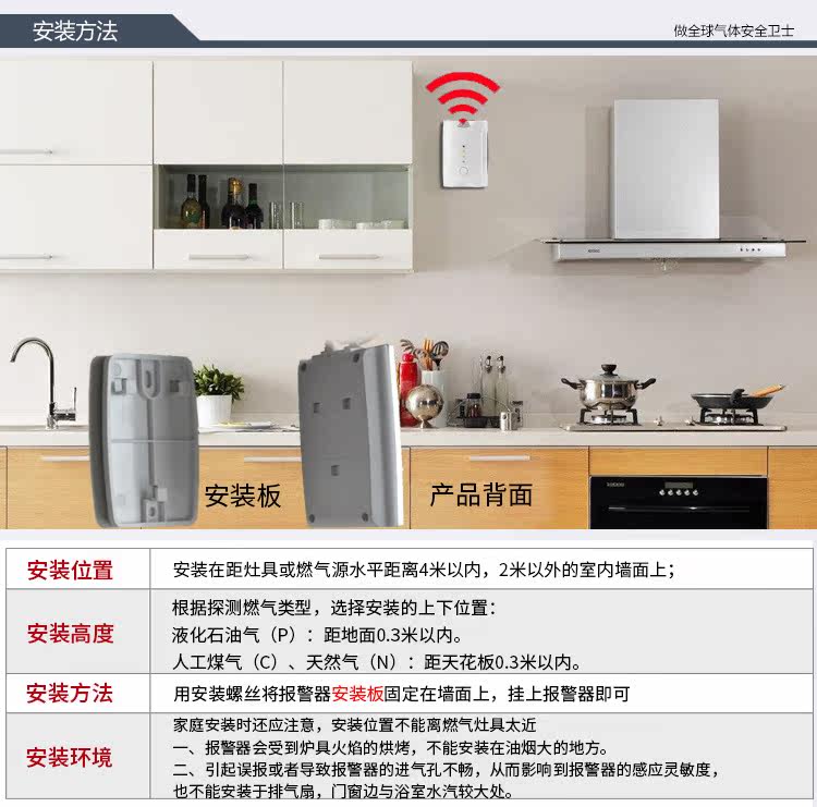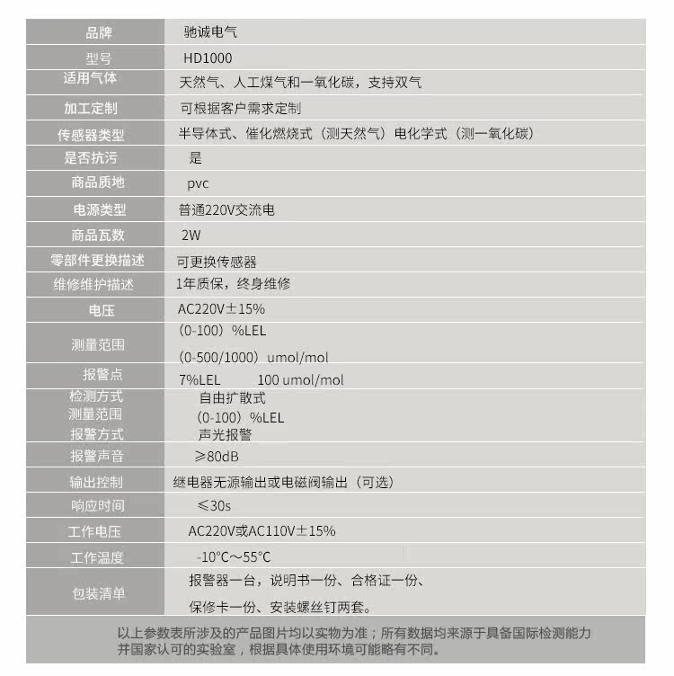 HD1000系列采用高精度气敏元件,模块化设计,具有极好的灵敏度和出色的重复性。产品可安装在厨房、燃气管道旁,出现燃气或CO泄露时发出声光报警信号,有效保障您的人身财产安全! 产品执行国家标准GB15322.2-2003《测量范围为0~100%LEL的独立式可燃气体检测器》。 功能特点 ◆使用高性能数字处理器,系统具有高可靠性 ◆高性能气敏传感器,高灵敏度 ◆快速预热,响应时间快 ◆电路板采用SMT工艺,提高了产品的可靠性。 ◆报警状态下,蜂鸣器频率随浓度变化而变化 ◆传感器自动检测和寿命到期提示功能,用户使用更放心 ◆使用寿命大于5年 ◆特别加入自动补偿功能,真正做到防止误报警和漏报警。 技术参数 ◆检测气体:天然气、人工CO,支持双气体检测 ◆检测方式:自由扩散式 ◆工作电压:AC220V±15% ◆测量范围:(0-100)%LEL ◆报警方式:声光报警 ◆电磁阀信号:DC 9V-12V ◆报警声音:≥80dB ◆响应时间:≤30s ◆工作温度:-10℃~55℃ ◆工作湿度:≤95%RH无冷凝 ◆产品尺寸:120mm(L)×82mm(W)×45mm(H)