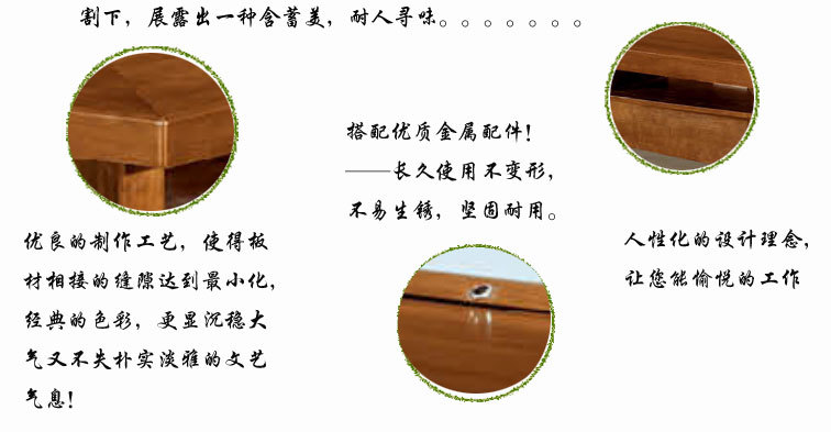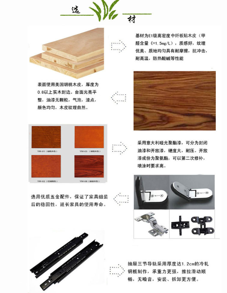 1、面材:高级胡桃木皮,纹理清晰自然,色泽一致,分布均匀. 2、基材:采用优质高密度中纤板制作,甲醛释放量达E1级环保,经防虫防腐处理; 3、油漆:采用“大宝”品牌环保树脂漆,保证台面透明度高,耐压,耐磨。 4、木皮:木纹、木射线清晰。同样应有自然瑕疵。 5、五金配件:采用高档防腐、防锈处理五金配件,优质无声导轨、门铰、拉手等。