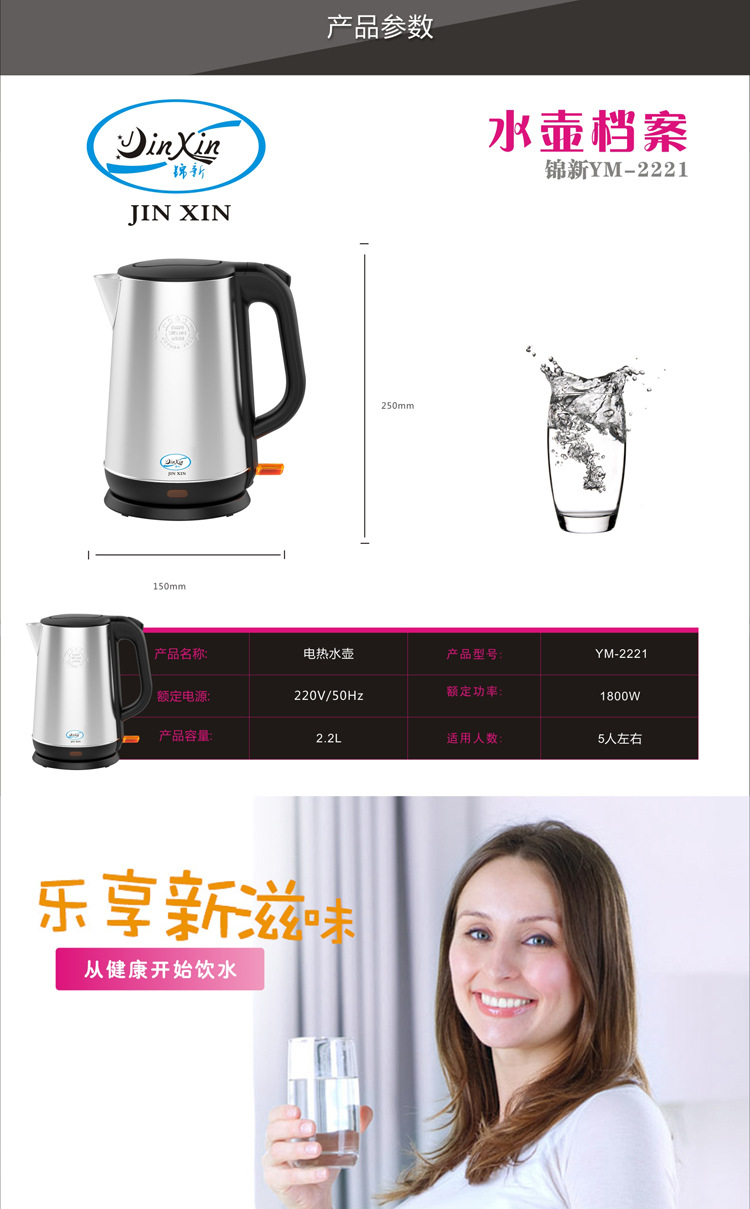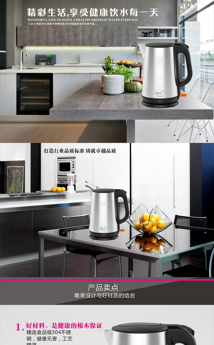 厂家直销304不锈钢大容量2.2L1800W电热水壶