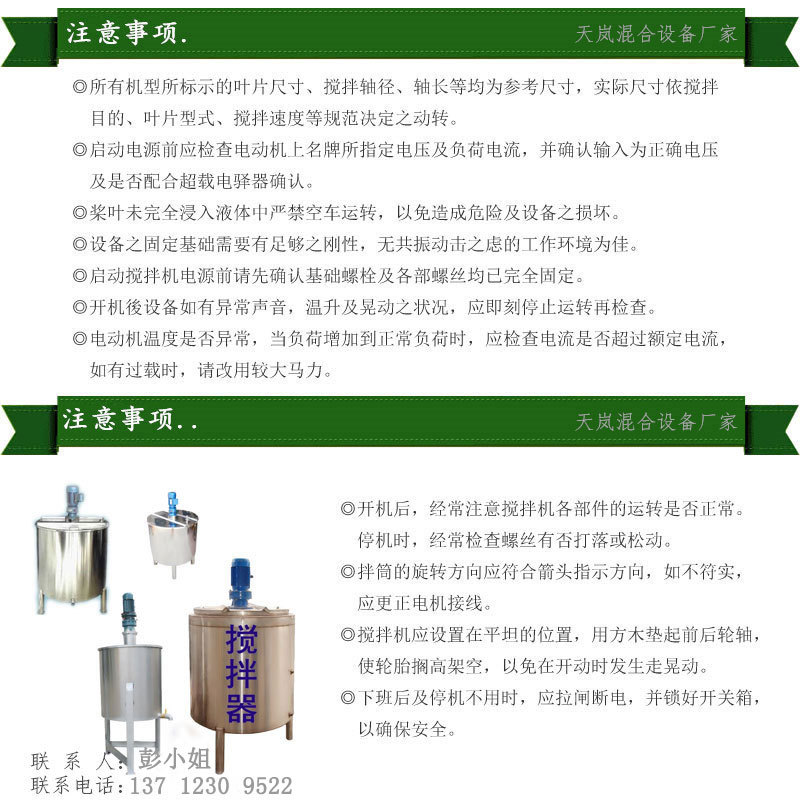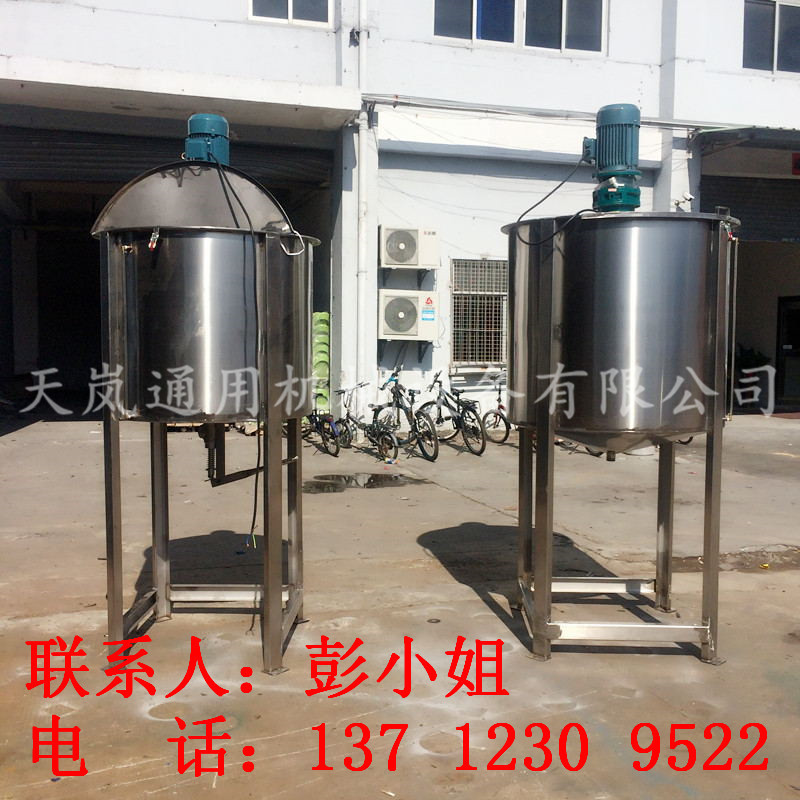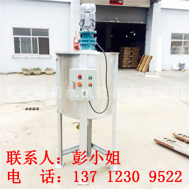 液体搅拌机涉及行业广泛,每个客户的具体情况、要求也各不相同,所以搅拌机品种多样,针对不同客户需要单独设计的非标准设备。天岚液体电加热搅拌机应用于液体的加热物体,如酸碱液、化学试剂、水、油等。一般以导热油为有机热载体或热介质油,导热油为介质加热温度比较高。若温度要求不高,也可以用水作为中间传热介质。多数客户选择用不锈钢材质制作,如:304、316不锈钢等为主,具有机械强度高、耐热、抗腐、不易结垢等优点。天岚机械满足您的要求,人性化设计,根据实际需要订做!