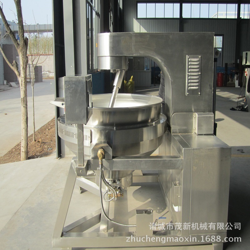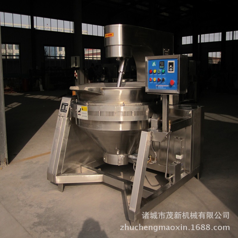 燃气搅拌炒锅为可倾式燃气搅拌炒锅,采用燃气(液化气、天然气、人工煤气)为能源,其锅身可以倾覆,以倒出锅内物料。搅拌电机为无级变速电机,可以在一定转速范围内任意调节,达到食品加工工艺要求。搅拌叶片拆洗容易,搅拌装置可升降,中心搅拌频率高且不破坏食材原状,又不会将菜炒焦。本设备主要材料为奥氏体不锈钢,符合卫生要求,外型造型美观大方,使用方便。独特的燃烧器燃烧充分、热效率高。广泛用于餐饮、食品加工、调味品、休闲食品、医药行业等领域。 大型食堂燃气炒菜锅 辣椒酱搅拌炒锅 咖喱酱、海鲜酱搅拌炒锅。