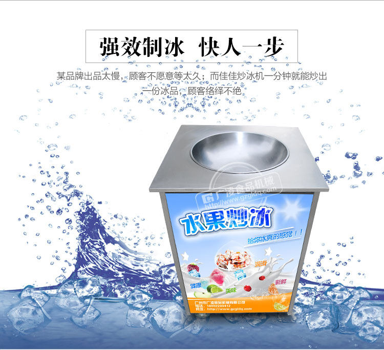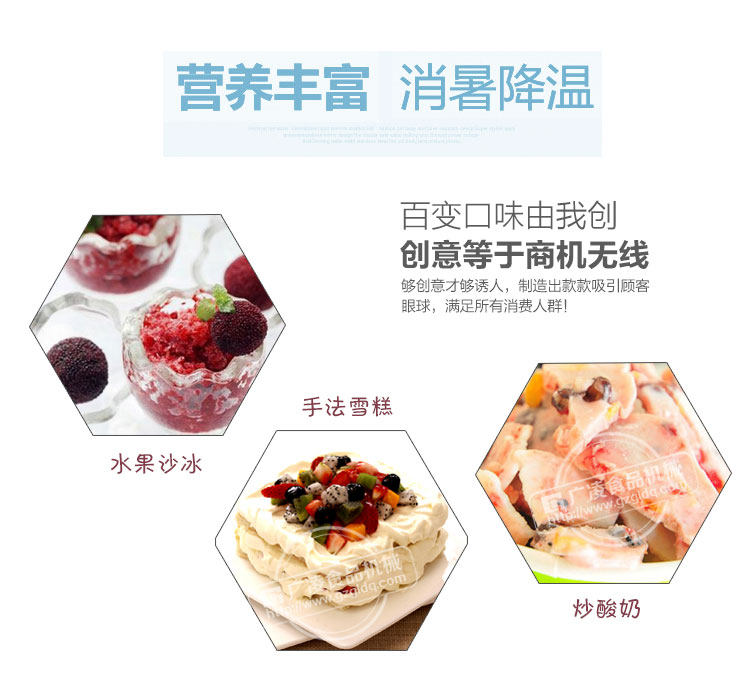 1、单圆锅炒冰机可制作多种口味冰淇淋炒冰、30多种水果炒冰,还可制作冰沙、冰粥、绿豆沙、啤酒炒冰等冷饮食品。