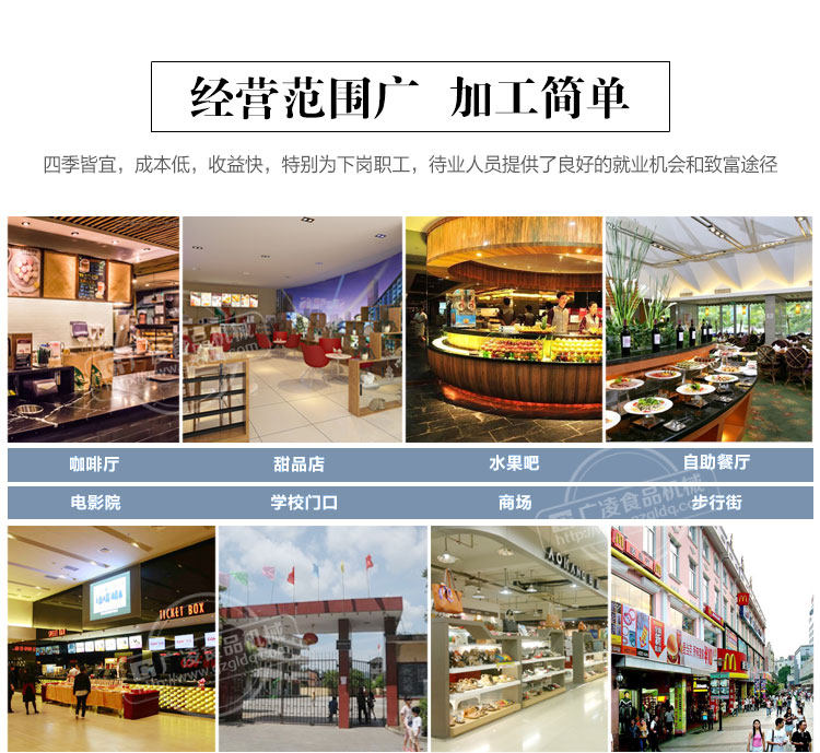 根据众多的购机客户的经营实践证明;凡人群密集的场所,都适合经营各式冷点并能获得很好的经济效益,这些场所主要有大、中、小学校门口,车站、码头、旅游景点、乡村集镇、庙会、十字街口繁华处、冷饮店、影剧院门口、酒吧、快餐店、公园等。既可设点固定销售也可流动销售。品种多样本机可生产冰砂、冰花、冰淇淋、雪蓉、雪泥、炒米、炒雪等一系列如冰似雪、消暑止渴、口味极佳,老少皆宜的各式休闲冷点。