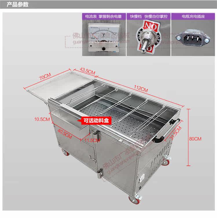 碳烤鸡炉操作: 1、烤鸡炉旋转于平稳的地方操作。 2、把机器下放的储物柜打开将电池放在储物柜内,电机有两条电源线夹子,红色接电池正极,黑色 接电池负极。 3、碳烤鸡炉用时需先生好火将炭放置于车内的炭盆内 4、配备了多条山字型铁叉,将事先腌制好的鸡,鸭,鱼等食物整齐的串在铁叉上 5、将铁叉的尖顶插在机器操作台面对方的小孔内手柄端有凸型轴,将凸型轴放在机器连轮带动轴的凹槽内,然后打开电源即可,可烧烤任何食物。 6、在不用旋转式烧烤时,也可将不锈钢烧烤网放在机器上可实现传统式的烧烤做法 7、电压显示在不低于12V时不需要充电
