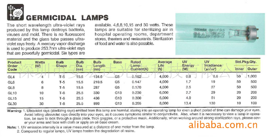 我公司经销的日本进口东芝品牌消毒管、杀菌灯管、紫外线灯、UV灯、消毒灯、空气净化灯、水处理灯管、水消毒管、GL消毒管:是低压汞蒸气放电灯,有石英管状玻璃外壳,发射短波紫外线辐射,253.7nm(UV-C)。