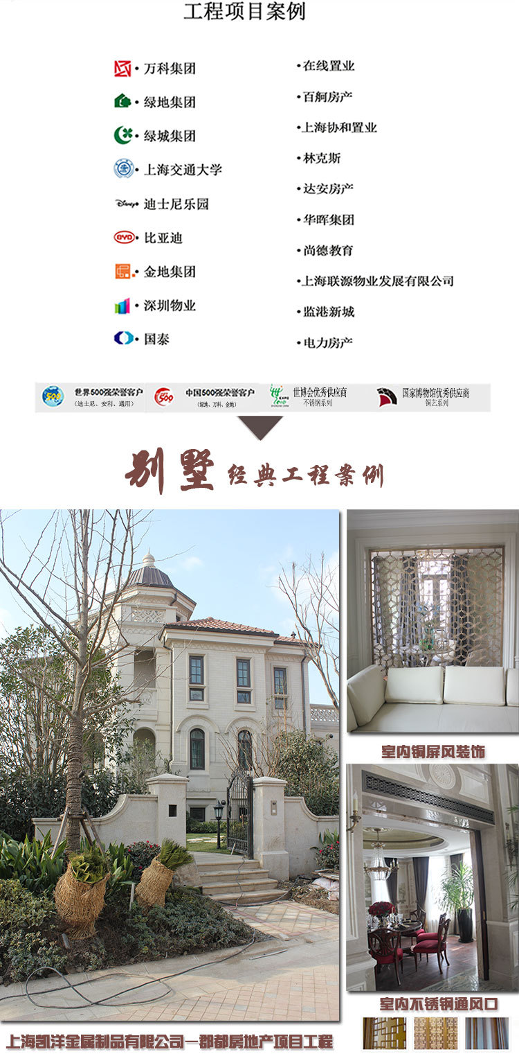 本公司专注高端艺术金属装饰工程20年,国内外大型建筑装饰工程经验丰富·金属装饰工程首选,自主生产基地,满足所有金属装饰工程所需,提供一整套建筑装饰解决方案,不仅仅是工程商,更是综合服务商。聘请同济大学建筑专业知名设计师,携手设计,满足您对金属装饰的所有需求,为您打造最经典的金属装饰工程。