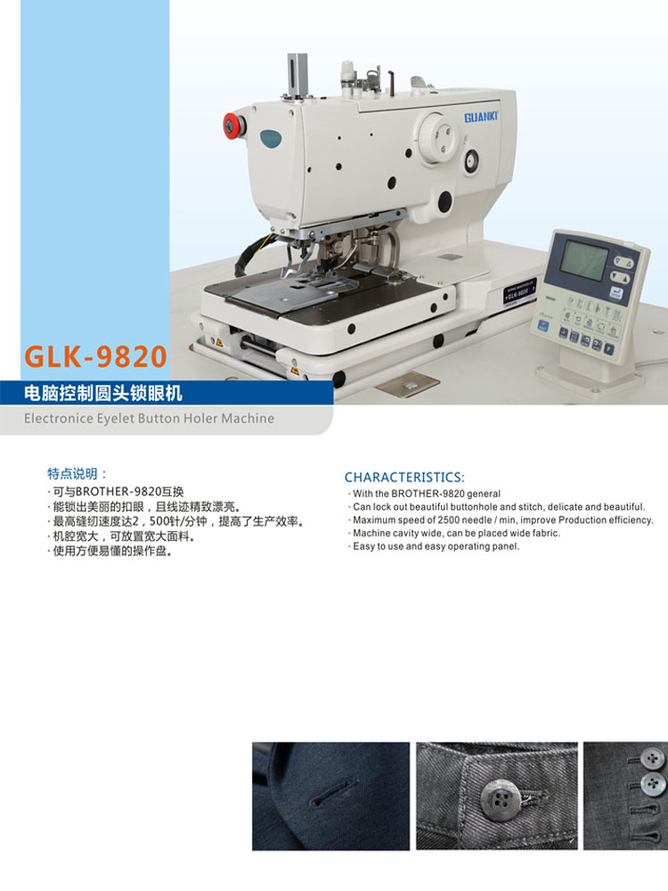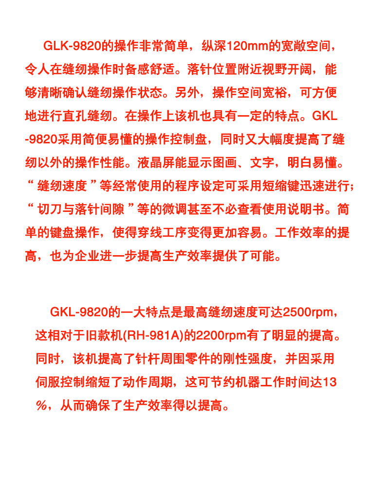 GLK-9820的操作非常简单,纵深120mm的宽敞空间,令人在缝纫操作时备感舒适。落针位置附近视野开阔,能够清晰确认缝纫操作状态。另外,操作空间宽裕,可方便地进行直孔缝纫。在操作上该机也具有一定的特点。GKL-9820采用简便易懂的操作控制盘,同时又大幅度提高了缝纫以外的操作性能。液晶屏能显示图画