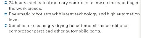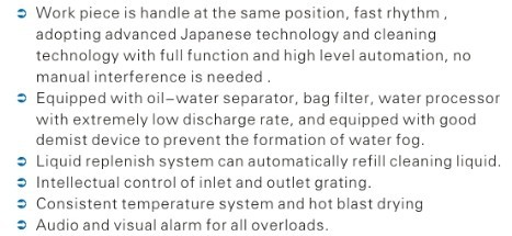 (一)同工位取放工件,生产节拍极快,采用先进的日本技术及清洗工艺、功能完善,自动化程度高,不须人工介入;