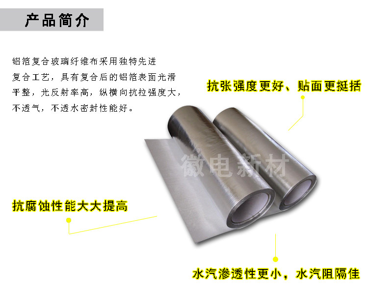 铝箔复合玻璃纤维布采用独特先进复合工艺,具有复合后的铝箔表面光滑平整,光反射率高,纵横向抗拉强度大,不透气,不透水密封性能好。