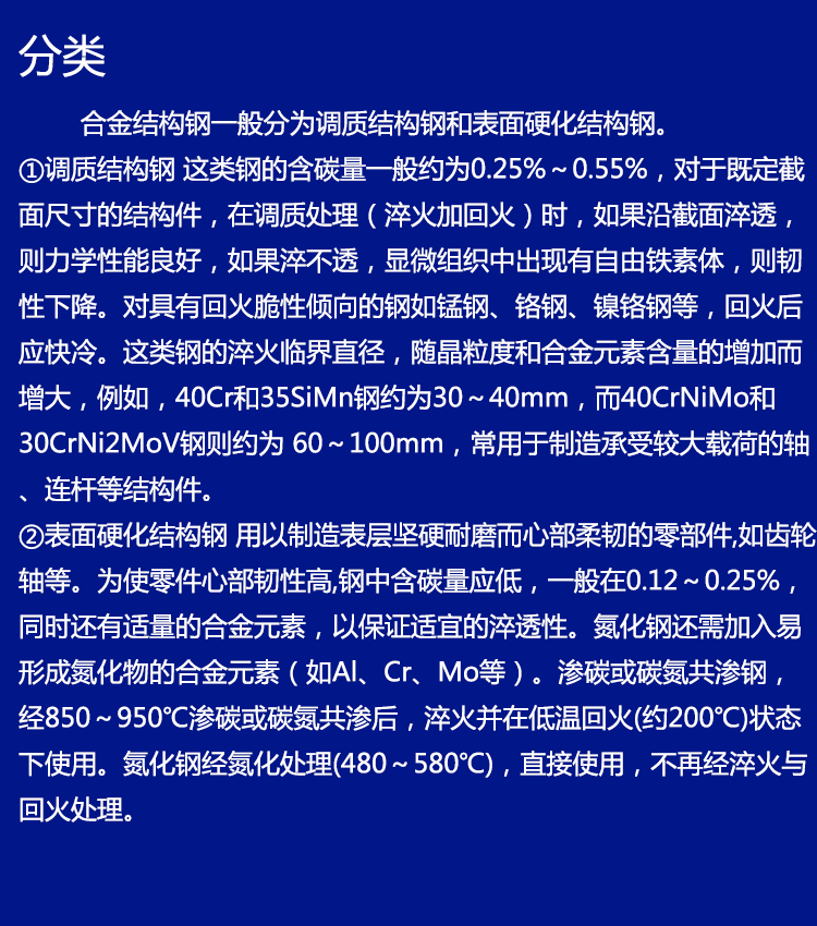有三个方面:①增大钢的淬透性。淬透性是指钢淬火时,从表层起淬成马氏体层的深度,是取得良好综合性能的主要参数。除Co外,几乎所有合金元素如 Mn、Mo、Cr、Ni、Si和C、N、B等都能提高钢的淬透性,其中 Mn、Mo、Cr、B的作用最强,其次是Ni、Si、Cu。而强碳化物形成元素如 V、Ti、Nb等,只有溶于奥氏体中时才能增大钢的淬透性。②影响钢的回火过程。由于合金元素在回火时能阻碍钢中各种原子的扩散,因而在同样温度下和碳素钢相比,一般均起到延迟马氏体的分解和碳化物的聚集长大作用,从而提高钢的回火稳定性,即提高钢的抗回火软化能力,V、W、Ti、Cr、Mo、Si的作用比较显著,Al、Mn、Ni的作用不明显。含有较高含量的碳化物形成元素如V、W、Mo等的钢,在500~600℃回火时,析出细小弥散的特殊碳化物质点如V4C3、Mo2C、W2C等,代替部分较粗大的合金渗碳体,使钢的强度不再下降反而升高,即出现二次硬化(见回火)。Mo对钢的回火脆性有阻止或减弱的作用。③影响钢的强化和韧化。Ni以固溶强化方式强化铁素体;Mo、V、Nb等碳化物形成元素,既以弥散硬化方式又以固溶强化方式提高钢的屈服强度;碳的强化作用最显著。此外,加入这些合金元素,一般都细化奥氏体晶粒,增加晶界的强化作用。影响钢的韧性因素比较复杂,Ni改善钢的韧性;Mn易使奥氏体晶粒粗化,对回火脆性敏感;降低P、S含量,提高钢的纯净度,对改善钢的韧性有重要作用(见金属的强化)。