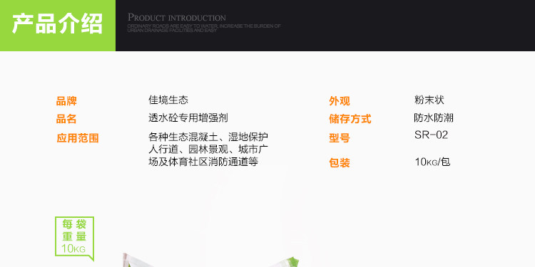 用法:将水泥、石子、透水砼增强剂、水按比例加入搅拌机中正常搅拌。
