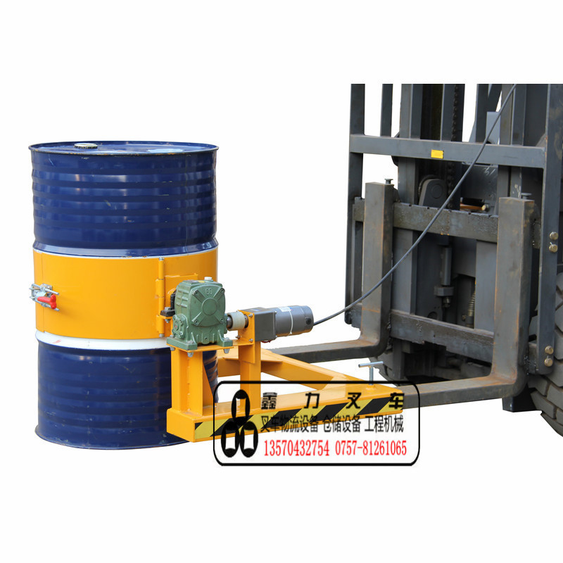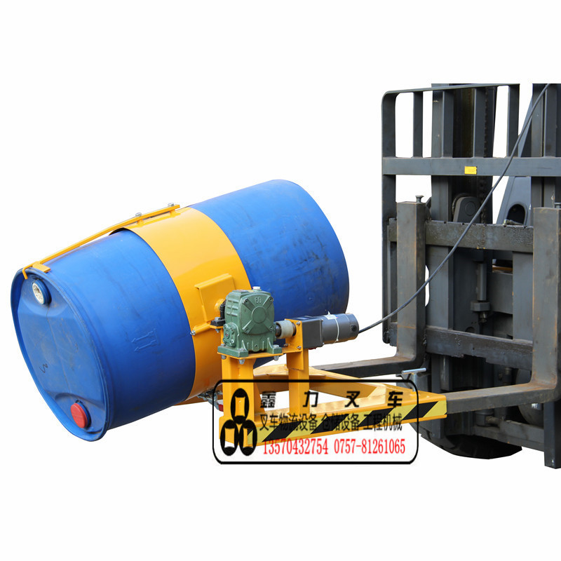 产品说明:★可用于55加仑钢制油桶和200L双层闭口塑料油桶 的吊运,堆放,360度电动旋转倒料。★采用12V,100W直流电机,可直接在叉车12V电瓶上使用,也可配电源.★适用于化工、食品车间、染料、涂料、胶粘剂、石油、食油等流质液体的搬运、装卸、倒料或配料使用。★黄色RAL1008喷粉,重型设计,结构巧妙,简单使用。