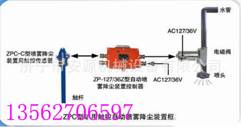 ZPC型矿用触控自动喷雾降尘装置,由ZP-127/36Z型自动喷雾降尘装置控制器,ZPC-C型喷雾降尘装置用触控传感器,以及执行器矿用防爆电磁阀等组成,该装置利用触、碰产生的信号控制洒水,适用于轨道运输巷、皮带机、溜煤眼等工作场所。当有人或物触碰到触控传感器时,触控传感器产生一个触发控制信号,通过电缆传至控制器,由控制器内的继电器打开电磁阀对运煤车或皮带进行洒水,除去机车、皮带运行时产生的粉尘,当机车驶过或煤流停止运行,洒水停止