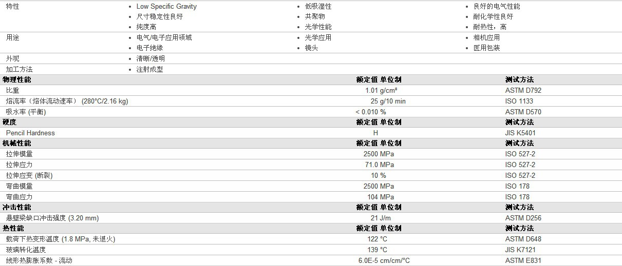 (1)密度小,比PMMA和PC约低10%,有利于制品轻量化;