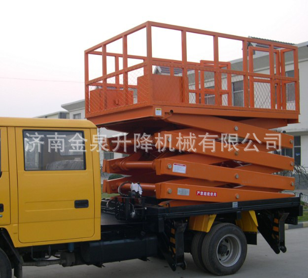 汽车载式液压升降台:是由升降台和汽车配套改装而成的。它接取汽车引擎动力,实现升降台的升降功能。适用于大流动量的高空作业。