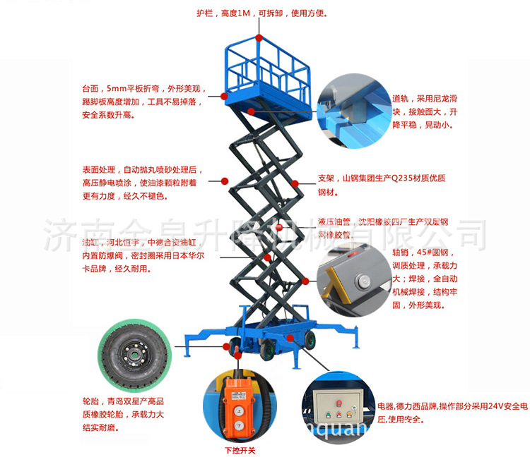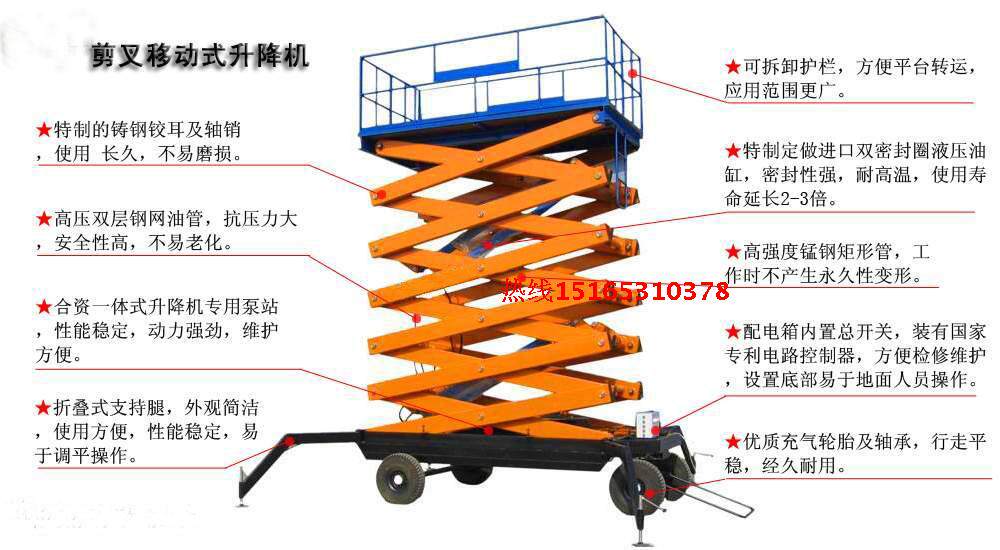 500、800公斤现货,如需特殊载重可订货,根据需求可选用380V、220V、电瓶、燃油机为升降动力特殊场所也可选用防暴电器等,本类产品手动、电动两用升降。产品优势:采用高强度锰钢结构,四轮移动方便、工作台面宽大,承载能力高,可多人同时作业,使高空作业更安全、效率更高。适用场所:工地、厂房、仓库、粮库、车站、宾馆、机场、码头、加油站、体育厂、高架管道等高空设备安装维修、清洁等,还用于起吊设备维护,野外电力设施维护,钢架结构厂房维护等